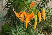 卷丹是百合科百合属植物。鳞茎近宽球形,鳞片宽卵形,呈白色;茎带紫色条纹,具白色绵毛;叶散生,矩圆状披针形或披针形,两面近无毛,先端有白毛,边缘有乳头状突起,上部叶腋有珠芽;花下垂,花被片披针形,…全部>>