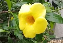 大花软枝黄蝉是软枝黄蝉的一个变种,夹竹桃科黄蝉属植物。藤状灌木,长达4米,枝条软弯垂,具白色乳汁。叶纸质,椭圆形、卵圆形或倒卵形,花序着花4-5朵,花冠比原变种大形,橙黄色,花冠喉部具5个发亮的斑点…全部>>