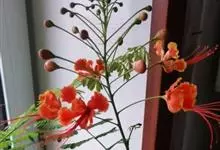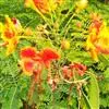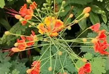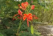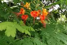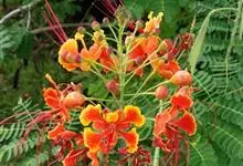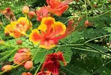 洋金凤 Sw.),豆科小凤花属灌木状或小乔木植物,枝无毛,绿或粉绿色;二回羽状复叶;总状花序伞房状,萼片无毛,花瓣橙红或黄色,圆形,花丝红色,子房无毛,花柱橙黄色;荚果窄而薄,…全部>>