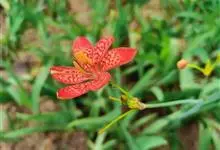 射干 Redouté)是鸢尾科射干属多年生草本植物。根状茎为不规则的块状,斜黄色或黄褐色;花橙红色,散生紫褐色的斑点;花药呈条形;子房下位,倒卵形;蒴果倒卵形或长椭圆形;种子圆球形,黑紫色,有光泽。…全部>>