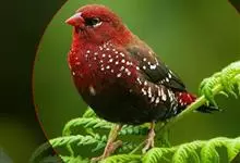 红梅花雀小型鸟类,体长9-10厘米。雄鸟通体朱红色,背、肩、胸等满布白色小斑点,两翅和尾黑褐色均具白色端斑,嘴红色,脚蜡黄色。雌鸟上体淡褐色或赭褐色,翅上中覆羽、大覆羽和内侧飞羽末端具白色斑点,…全部>>