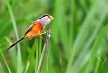 点胸鸦雀是莺科、鸦雀属小型鸟类,体长18-21厘米。头顶至枕橙棕色,嘴橙黄色、短而粗厚,脸皮黄色,耳覆羽和颊后部黑色,眼圈白色。上体棕褐色。颏黑色,其余下体淡皮黄白色,喉和上胸具黑色矢状斑。…全部>>