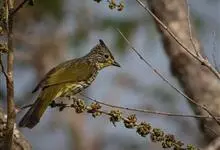 纵纹绿鹎,是鹎科鹎属的一种动物,是体型中等大小鸟类,体长20-24厘米。头绿褐色具明显的冠羽,其上具细的白色纵纹。上体橄榄绿色具细的白色纵纹。眼圈浅黄色。喉和尾和覆羽黄色,其余下体暗灰黑色具黄白色纵纹。…全部>>