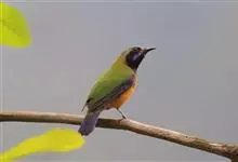 橙腹叶鹎体形大小和金额叶鹎相似,体长16~20厘米。额至后颈黄绿色,其余上体绿色,小覆羽亮钴蓝色,形成明显的肩斑。颏、喉、上胸黑色具钴蓝色髭纹,其余下体橙色。飞羽和尾羽雄鸟黑色、雌鸟绿色。…全部>>