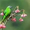 蓝翅叶鹎:小型鸟类,体长15-18厘米。雄鸟通体草绿色,尾蓝绿色,肩和翅亮蓝 色,胸缀有黄色,颏、喉黑色。雌鸟颏,喉蓝绿色。栖息在海拔1500米以下的常绿阔叶林、次生林和林缘疏林灌丛中。…全部>>