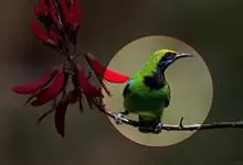 蓝翅叶鹎:小型鸟类,体长15-18厘米。雄鸟通体草绿色,尾蓝绿色,肩和翅亮蓝 色,胸缀有黄色,颏、喉黑色。雌鸟颏,喉蓝绿色。栖息在海拔1500米以下的常绿阔叶林、次生林和林缘疏林灌丛中。…全部>>