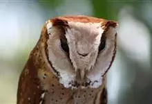 栗鸮:是鸟纲、草鸮科的猫头鹰。体长约29厘米,体重311-360克。是一种中等体型的红褐色鸮。其心形脸庞及时而竖起的“耳朵”与仓鸮甚似。上体红褐而具黑白点斑,下体皮黄偏粉具黑点,脸近粉色。虹膜深褐色,…全部>>