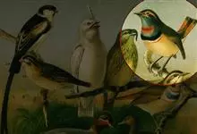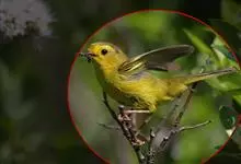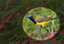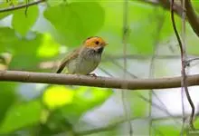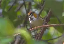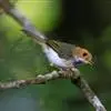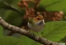 棕脸鹟莺:体长10厘米,是一种色彩亮丽而有特色的莺鸟。头栗色,具黑色侧冠纹。上体绿,腰黄色。下体白,颏及喉杂黑色点斑,上胸沾黄。与栗头鹟莺的区别在头侧栗色,白色眼圈不显著且无翼斑。…全部>>