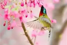 绿喉太阳鸟:共有9个亚种。小型鸟类,雄鸟体长13-15厘米、雌鸟10-12厘米。雄鸟前额至后颈、颏和喉辉绿色,头侧黑色,颈侧和背暗红色,两肩、下背橄榄绿色,腰鲜黄色,尾上覆羽和中央尾羽暗绿色,…全部>>