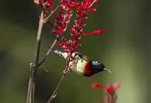 黄腰太阳鸟共有16个亚种,小型鸟类,体长10-15厘米。嘴细长而向下弯曲,雄鸟额和头顶前部金属绿色,头顶后部橄榄褐色。其余头、颈、背、肩、颏、喉、胸以及翅上中覆羽和小覆羽概为红色,腰黄色,…全部>>