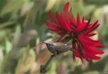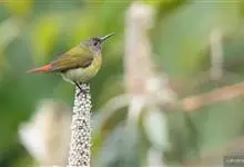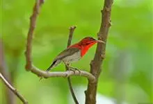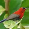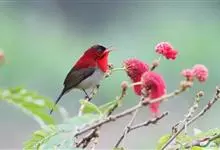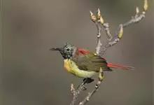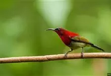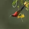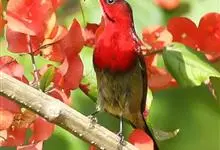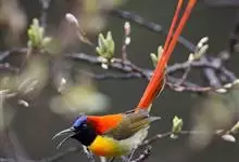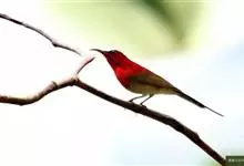 火尾太阳鸟为太阳鸟科太阳鸟属的鸟类。体长20厘米,色彩艳丽。雄鸟红色,具形长的艳猩红色中央尾羽。头顶金属蓝色,眼先和头侧黑色,喉及髭纹金属紫色。下体黄色,胸具艳丽的橘黄色块斑。雌鸟灰橄榄色,腰黄,…全部>>