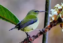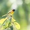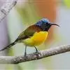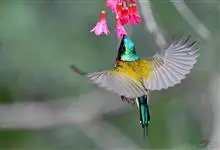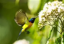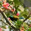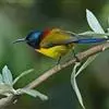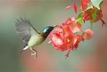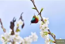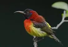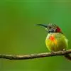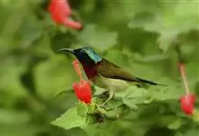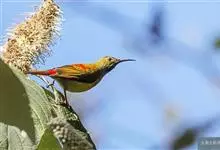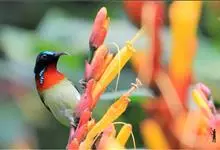 绿喉太阳鸟:共有9个亚种。小型鸟类,雄鸟体长13-15厘米、雌鸟10-12厘米。雄鸟前额至后颈、颏和喉辉绿色,头侧黑色,颈侧和背暗红色,两肩、下背橄榄绿色,腰鲜黄色,尾上覆羽和中央尾羽暗绿色,…全部>>