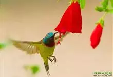 叉尾太阳鸟,雀形目太阳鸟科太阳鸟属留鸟;为小型鸟类,雄鸟头顶辉蓝绿色,上体橄榄绿色,腰明黄色,中央尾羽亮翠蓝色,羽轴针状延长,外侧尾羽黑色具白色端斑,头侧黑色,颜、喉和胸为绛红色,…全部>>