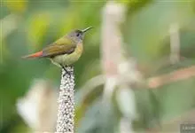 黄腰太阳鸟共有16个亚种,小型鸟类,体长10-15厘米。嘴细长而向下弯曲,雄鸟额和头顶前部金属绿色,头顶后部橄榄褐色。其余头、颈、背、肩、颏、喉、胸以及翅上中覆羽和小覆羽概为红色,腰黄色,…全部>>