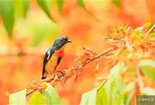 朱背啄花鸟:体重6-8克,体长81-97毫米。是一种小型的黑色及红色啄花鸟。雄鸟顶冠、背及腰猩红色,两翼、头侧及尾黑,两胁灰,下体余部白色。雌鸟上体橄榄色,腰及尾上覆羽猩红,尾黑。亚成鸟清灰色,嘴橘黄,…全部>>