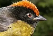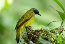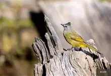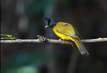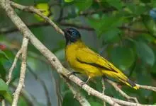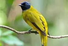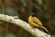 黑冠黄鹎:体长18-21厘米,是一种中等体型偏黄色鹎。整个头、颈、颏、喉黑色,头顶有显著直立的羽冠,黑色,上体褐橄榄黄绿色,下体橄榄黄色。虹膜偏红;嘴及脚黑色。…全部>>