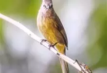 黄绿鹎,小型鸟类,体长19-22厘米。额至头顶暗褐具灰色羽缘,眼先黑色,其上面有一粗著的白纹从鼻后至眼,在黑色的头部极为醒目。上体橄榄绿褐色。颏、喉淡灰色或灰白色,胸灰褐色具橄榄黄色羽缘,…全部>>