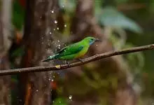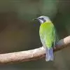 蓝翅叶鹎:小型鸟类,体长15-18厘米。雄鸟通体草绿色,尾蓝绿色,肩和翅亮蓝 色,胸缀有黄色,颏、喉黑色。雌鸟颏,喉蓝绿色。栖息在海拔1500米以下的常绿阔叶林、次生林和林缘疏林灌丛中。…全部>>