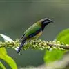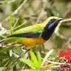 金额叶鹎是和平鸟科、叶鹎属的鸟类。体长16-20厘米。额和头顶前部金桔色,整个上体包括两翅表面草绿色。颏、喉黑色,其外围有一圈黄色,其余下体浅绿色,翼缘蓝紫色,翅上小覆羽翠蓝色。野外特征极明显,…全部>>