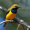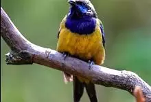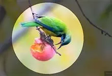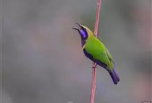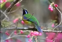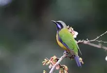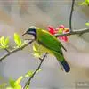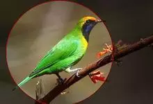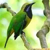 蓝翅叶鹎:小型鸟类,体长15-18厘米。雄鸟通体草绿色,尾蓝绿色,肩和翅亮蓝 色,胸缀有黄色,颏、喉黑色。雌鸟颏,喉蓝绿色。栖息在海拔1500米以下的常绿阔叶林、次生林和林缘疏林灌丛中。…全部>>