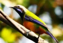 橙腹叶鹎体形大小和金额叶鹎相似,体长16~20厘米。额至后颈黄绿色,其余上体绿色,小覆羽亮钴蓝色,形成明显的肩斑。颏、喉、上胸黑色具钴蓝色髭纹,其余下体橙色。飞羽和尾羽雄鸟黑色、雌鸟绿色。…全部>>