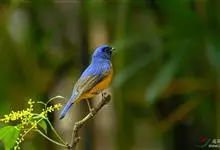 棕腹蓝仙鹟,Niltava vivida,鹟科仙鹟属的一种小型鸣禽,善在空中飞捕昆虫,中等体型18厘米,上体蓝,下体棕色,具黑色眼罩,胸橘黄渐变成臀部的皮黄色。国内分布于四川、云南、西藏和台湾等地。…全部>>