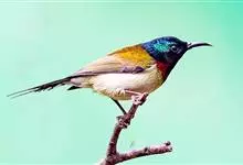 绿喉太阳鸟:共有9个亚种。小型鸟类,雄鸟体长13-15厘米、雌鸟10-12厘米。雄鸟前额至后颈、颏和喉辉绿色,头侧黑色,颈侧和背暗红色,两肩、下背橄榄绿色,腰鲜黄色,尾上覆羽和中央尾羽暗绿色,…全部>>