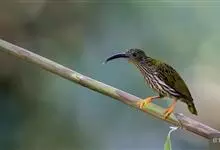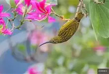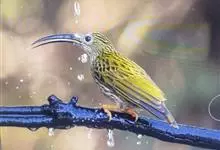 纹背捕蛛鸟:为太阳鸟科捕蛛鸟属的鸟类。是太阳鸟科中体型较大的一种,体重25-45克,体长160-210毫米。嘴粗长而尖且向下弯曲。上体橄榄黄色具黑色中央斑纹。下体淡黄白色满布黑色纵纹,尾具黑色次端斑。…全部>>