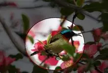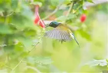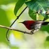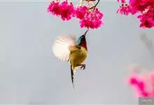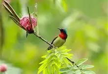 叉尾太阳鸟,雀形目太阳鸟科太阳鸟属留鸟;为小型鸟类,雄鸟头顶辉蓝绿色,上体橄榄绿色,腰明黄色,中央尾羽亮翠蓝色,羽轴针状延长,外侧尾羽黑色具白色端斑,头侧黑色,颜、喉和胸为绛红色,…全部>>