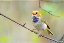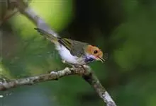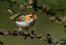 棕脸鹟莺:体长10厘米,是一种色彩亮丽而有特色的莺鸟。头栗色,具黑色侧冠纹。上体绿,腰黄色。下体白,颏及喉杂黑色点斑,上胸沾黄。与栗头鹟莺的区别在头侧栗色,白色眼圈不显著且无翼斑。…全部>>