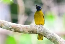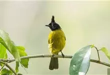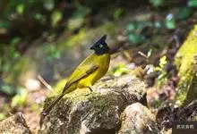 黑冠黄鹎:体长18-21厘米,是一种中等体型偏黄色鹎。整个头、颈、颏、喉黑色,头顶有显著直立的羽冠,黑色,上体褐橄榄黄绿色,下体橄榄黄色。虹膜偏红;嘴及脚黑色。…全部>>