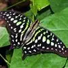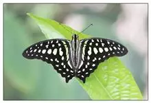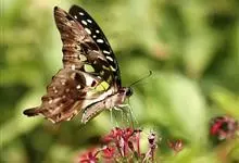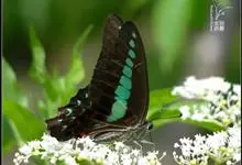 青带凤蝶Graphium sarpedon ,又名青凤蝶,是最普遍的中型凤蝶,飞行速度很快。青带凤蝶的翅膀中央有许多浅蓝色的斑点,很整齐地排列成一条直线。这些斑点由上而下逐渐变大,就像一条青色的带子。全部>>
