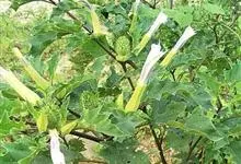 曼陀罗,茄科曼陀罗属一年生大型草本植物,全株光滑。有臭气;叶呈广卯形,边缘具不规则波状浅齿裂;花单生于枝杖间或叶腋,直立,有短梗;花萼是筒状裂片三角形,颜色为白色或淡紫色;果实为蒴果卵状,…全部>>