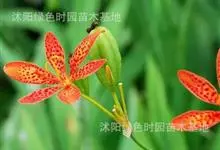 射干 Redouté)是鸢尾科射干属多年生草本植物。根状茎为不规则的块状,斜黄色或黄褐色;花橙红色,散生紫褐色的斑点;花药呈条形;子房下位,倒卵形;蒴果倒卵形或长椭圆形;种子圆球形,黑紫色,有光泽。…全部>>