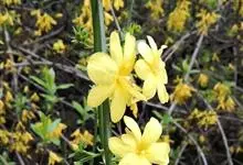 迎春花,木犀科素馨属的多年生木本植物,小枝细长直立或者呈拱形下垂;叶片呈卵形或椭圆形;花单生于叶腋处,苞片呈披针形或椭圆形,花冠为金黄色,花瓣通常为倒卵形或椭圆形;花期在6月。…全部>>