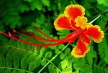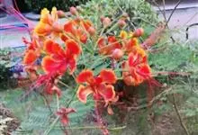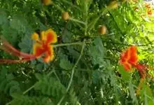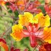 洋金凤 Sw.),豆科小凤花属灌木状或小乔木植物,枝无毛,绿或粉绿色;二回羽状复叶;总状花序伞房状,萼片无毛,花瓣橙红或黄色,圆形,花丝红色,子房无毛,花柱橙黄色;荚果窄而薄,…全部>>