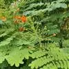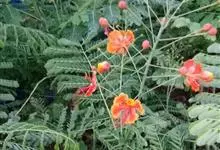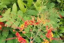 洋金凤 Sw.),豆科小凤花属灌木状或小乔木植物,枝无毛,绿或粉绿色;二回羽状复叶;总状花序伞房状,萼片无毛,花瓣橙红或黄色,圆形,花丝红色,子房无毛,花柱橙黄色;荚果窄而薄,…全部>>