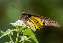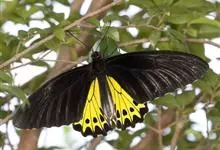 金裳凤蝶是凤蝶科、裳凤蝶属的动物。金裳凤蝶身体呈黑色,头、颈和胸侧有红毛,腹部有黑黄两色相间条纹,雄蝶前翅黑色,具黑天鹅绒光泽,各脉两侧灰白色,后翅金黄色,各室外缘有等腰三角形黑斑1枚,斑内侧有晕,…全部>>