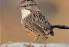 金眼鹛雀是莺科、鹛雀属小型鸟类。体长16-20厘米。头顶和上体棕褐色,两翅表面肉桂红色,尾褐色具明暗相间横斑。眼周金黄色,眼先、眼上、眼下、颊以及颏、喉和上胸概为白色,其余下体茶黄色,脚橙黄色。…全部>>