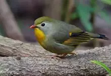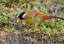 银耳相思鸟小型鸟类,体长14~18厘米。头顶黑色,耳羽银灰色,前额橙黄色;外侧飞羽橙黄色,基部朱红色,极为鲜艳、醒目。尾圆形,尾上、尾下覆羽朱红色,尾暗灰褐色,外侧尾羽橙黄色,其余上体橄榄绿或橄榄黄色。…全部>>