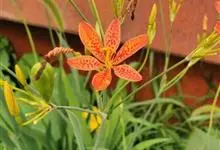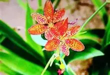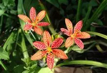 射干 Redouté)是鸢尾科射干属多年生草本植物。根状茎为不规则的块状,斜黄色或黄褐色;花橙红色,散生紫褐色的斑点;花药呈条形;子房下位,倒卵形;蒴果倒卵形或长椭圆形;种子圆球形,黑紫色,有光泽。…全部>>