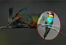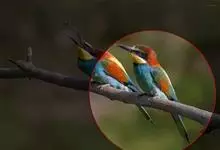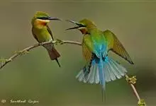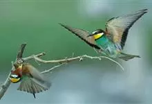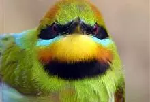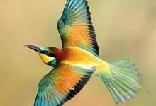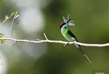 栗喉蜂虎是蜂虎科蜂虎属的鸟类。有热带鸟类羽毛艳丽的特征:喉部是栗红色的,黑色的过眼纹,翅膀和背部是绿色的,尾翼是蓝色的,飞行时翅膀下面的羽毛是橙黄色的,在阳光的照射下,它们全身闪烁着金属般的艳丽光泽,…全部>>