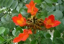 火焰木,又名苞萼木、喷泉树,为紫葳科常绿大乔木,株高10—20米,叶为奇数羽状复叶,对生,较大,斜椭圆形,全缘,纸质,叶面深绿色。 全部>>