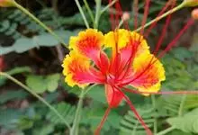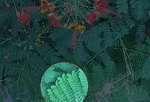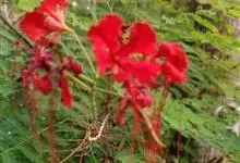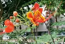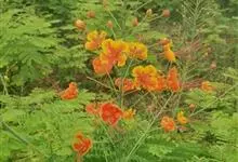 洋金凤 Sw.),豆科小凤花属灌木状或小乔木植物,枝无毛,绿或粉绿色;二回羽状复叶;总状花序伞房状,萼片无毛,花瓣橙红或黄色,圆形,花丝红色,子房无毛,花柱橙黄色;荚果窄而薄,…全部>>
