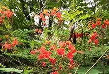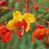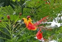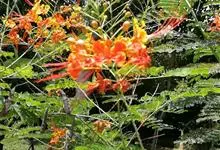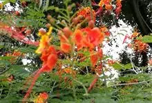 洋金凤 Sw.),豆科小凤花属灌木状或小乔木植物,枝无毛,绿或粉绿色;二回羽状复叶;总状花序伞房状,萼片无毛,花瓣橙红或黄色,圆形,花丝红色,子房无毛,花柱橙黄色;荚果窄而薄,…全部>>