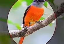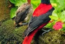 朱鹂:中等鸟类,体长23-28厘米。雄鸟绛紫红色,头、上胸及翼黑色。雌鸟上背及背部深灰色,尾覆羽及尾绛紫红色,腹部及下胸白而密布黑色纵纹。与鹊色鹂幼鸟的区别在上背灰色较深,下体白色较少且纵纹较粗。…全部>>