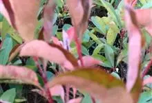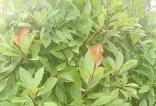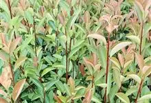 红叶石楠 是蔷薇科,石楠属杂交种,为常绿小乔木或灌木,乔木高可达5米、灌木高可达2米。叶片革质,长圆形至倒卵状、披针形,叶端渐尖,叶基楔形,叶缘有带腺的锯齿,花多而密,复伞房花序,花白色,梨果黄红色,…全部>>