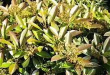 石楠 Kalkman),是蔷薇科石楠属的常绿乔木,高5~12米,株型紧凑,树冠圆球形。树枝为褐灰色;鳞片为褐色,没有毛;叶片革质,长椭圆至侧卵状椭圆形,有锯齿,新叶红色光亮。复伞房花序,白色小花,…全部>>