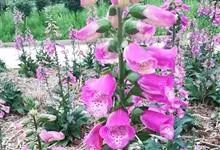 毛地黄是车前科、毛地黄属一年生或多年生草本植物。株高0.5—1米,茎直立,少分枝,全株被灰白色短柔毛和腺毛叶基生,呈莲座状,卵圆形或卵状披针形。顶生总状花序,花冠钟状,紫红色,内面有浅白斑点。菊果卵形。…全部>>