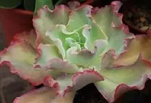 女王花笠,又名扇贝石莲花、女王花舞笠,是景天科拟石莲花属的多肉植物。由美国加利福尼亚州的育种师Dick Wright于1964年培育。特征是呈大波浪状褶皱的红色叶缘和气质高贵的粉紫色调。…全部>>